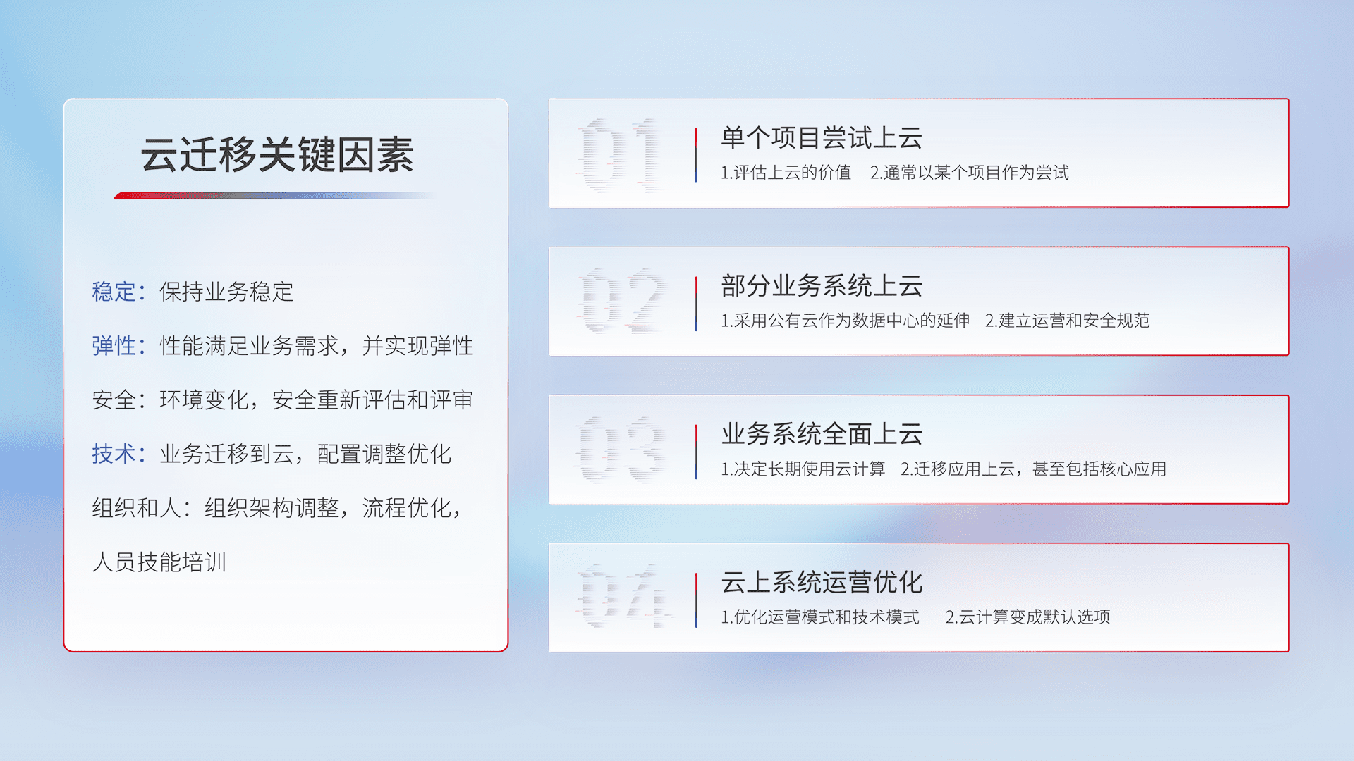 结合实际业务,,从规划设计、、、、云平台选型、、、云原生改造、、、数据迁移、、、集成交付,,,迁移全过程为客户识别最佳上云路径,,,做好风险识别管理,,,设计网络架构、、、、身份权限、、安全审计合规、、、、操作审计、、、日志审计、、、、监控告警策略、、、、多站点容灾设计等,,对云上基础设施进行整体规划,,提升IT治理水平,,以满足弹性、、、、高可用、、、高性能的需求。。。。