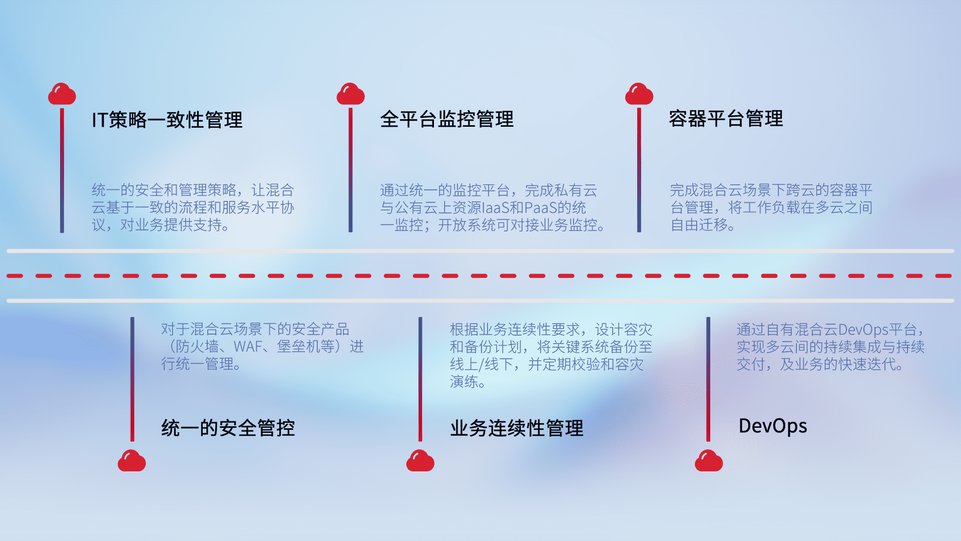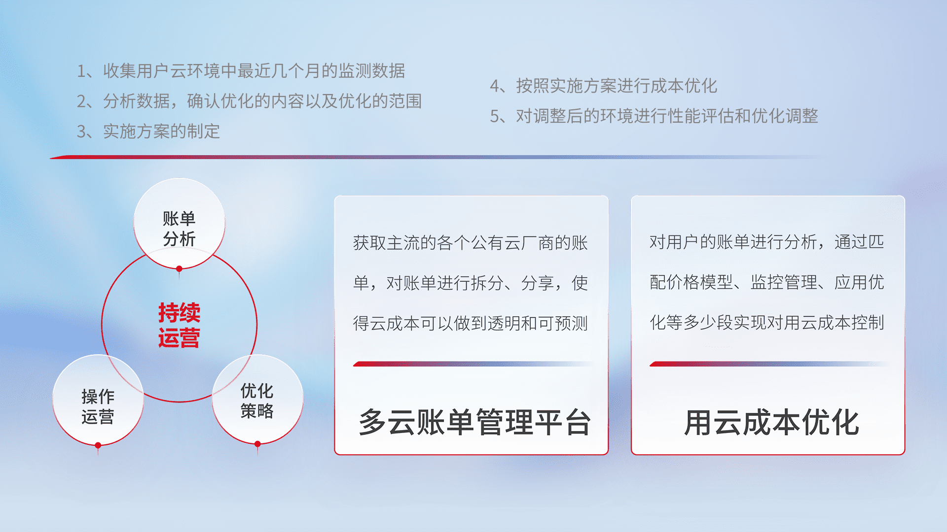 通过多云纳管,,以统一的资源数据模型把客户的云资源进行抽象和封装,,,进而实现对多云资源的统一操作,,,,保障云资源管理的可靠性、、、稳定性与可用性。。量身定制化运维内容,,,,配置、、开发运维、、、、补丁管理、、、、备份、、监控、、认证和访问管理、、审计和日常巡检等,,保障在用云过程中的可靠度,,,稳定度以及高可用率。。。