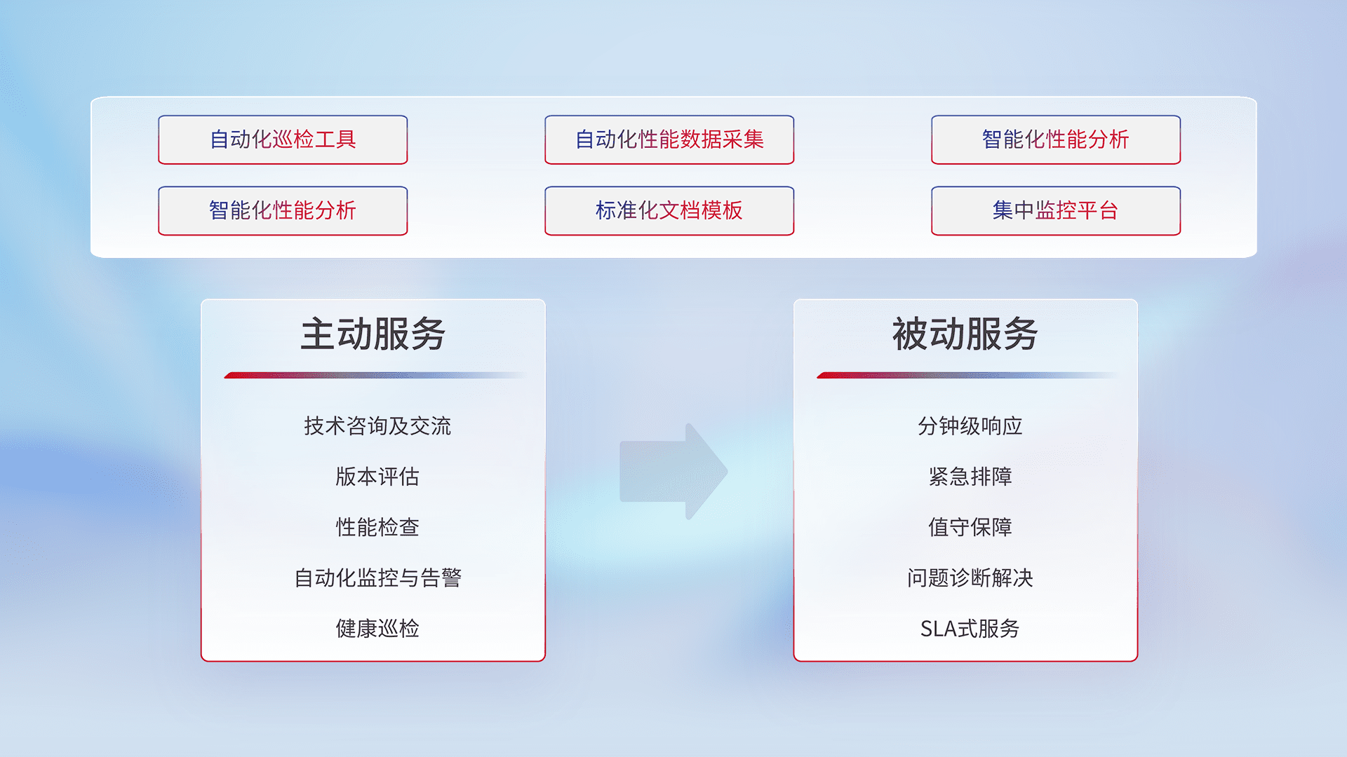 智能化工具和标准化文档,,,保障服务质量,,提供主动服务(包含技术咨询、、版本评估、、、、性能检查、、、、自动化监控与告警、、、健康巡检)和被动服务包含(分钟级响应、、紧急排障、、值守保障、、问题诊断解决、、、、SLA服务)。。